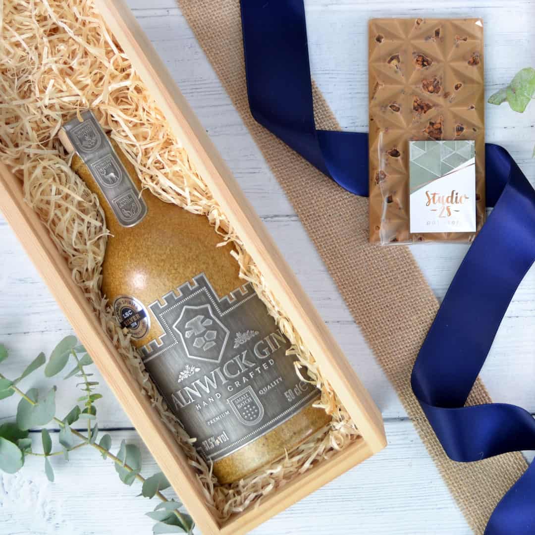 The Alnwick Gin & Chocolate Box features an award winning locally produced gin. An expert infusion of botanical’s and exotic spices, of which include rosemary and lavender. The result is a beautifully unique taste. Alnwick Gin is handcrafted in Northumberland in batches of no more than 100 litres. The bottle is beautifully presented with an eye catching pewter label. We have also chosen to include a Caramel Chocolate & Hazelnut bar by Studio 28 Patisserie. A very talented patisserie chef in the heart of Newcastle.