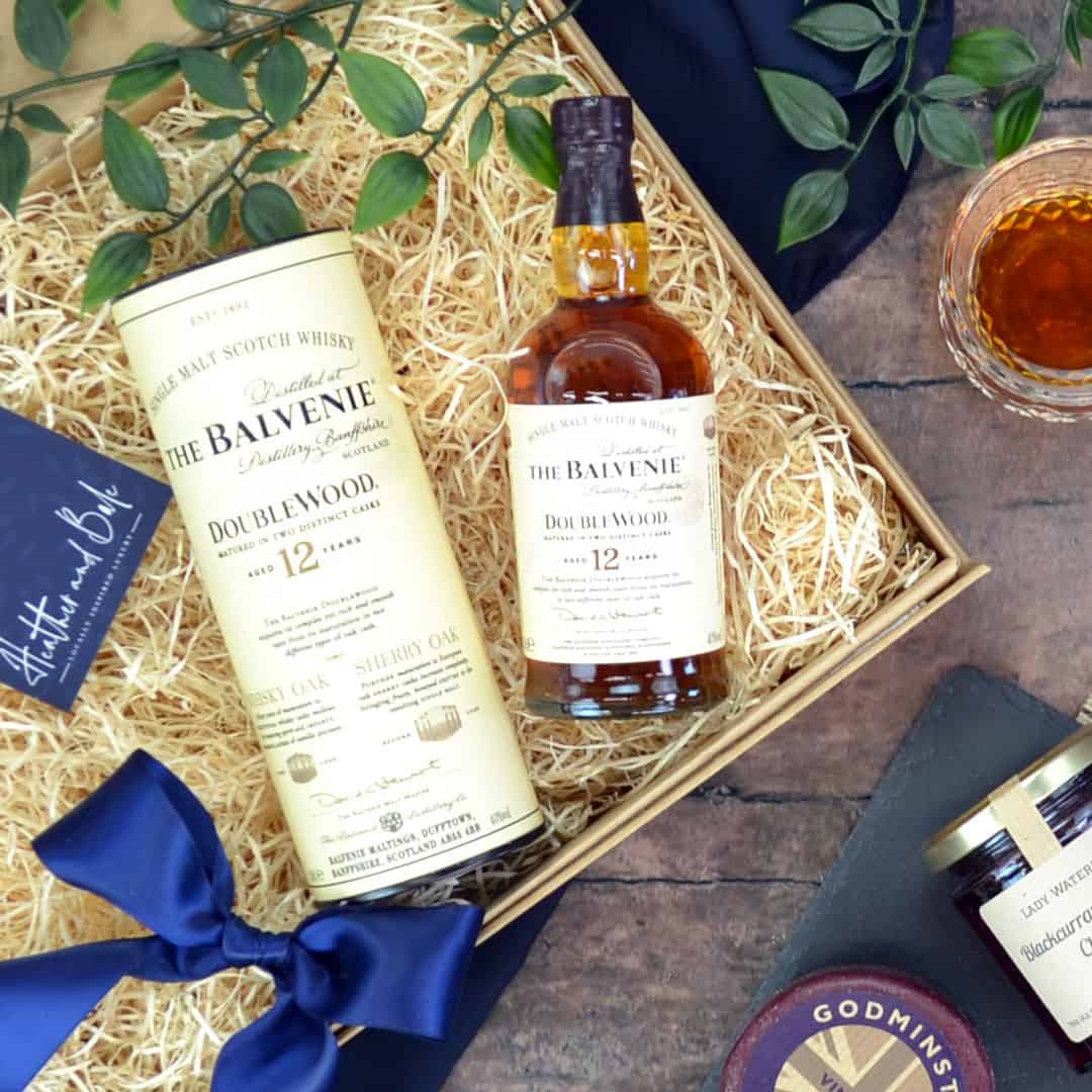 The Balvenie Whisky & Treats Box from Heather and Bale, the perfect gift for any whisky lover. This luxury whisky hamper contains carefully selected treats to complement the rich, full-bodied flavour of the Balvenie 12 year old Double Wood.