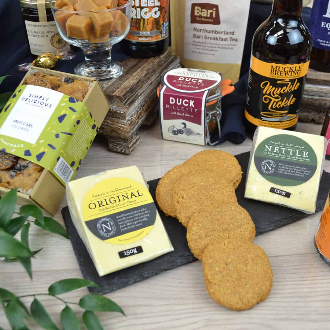 Next, a huge selection of sweet, savoury and snacks. There’s farmhouse cheese, several artisan preserves, savoury cheese biscuits and a fruit cake, designed to be enjoyed with cheese. Savour alongside a flavourful duck rillette with black cherry. Also, there’s a huge bag of Farmhouse Cheddar and Onion crisps to share.
