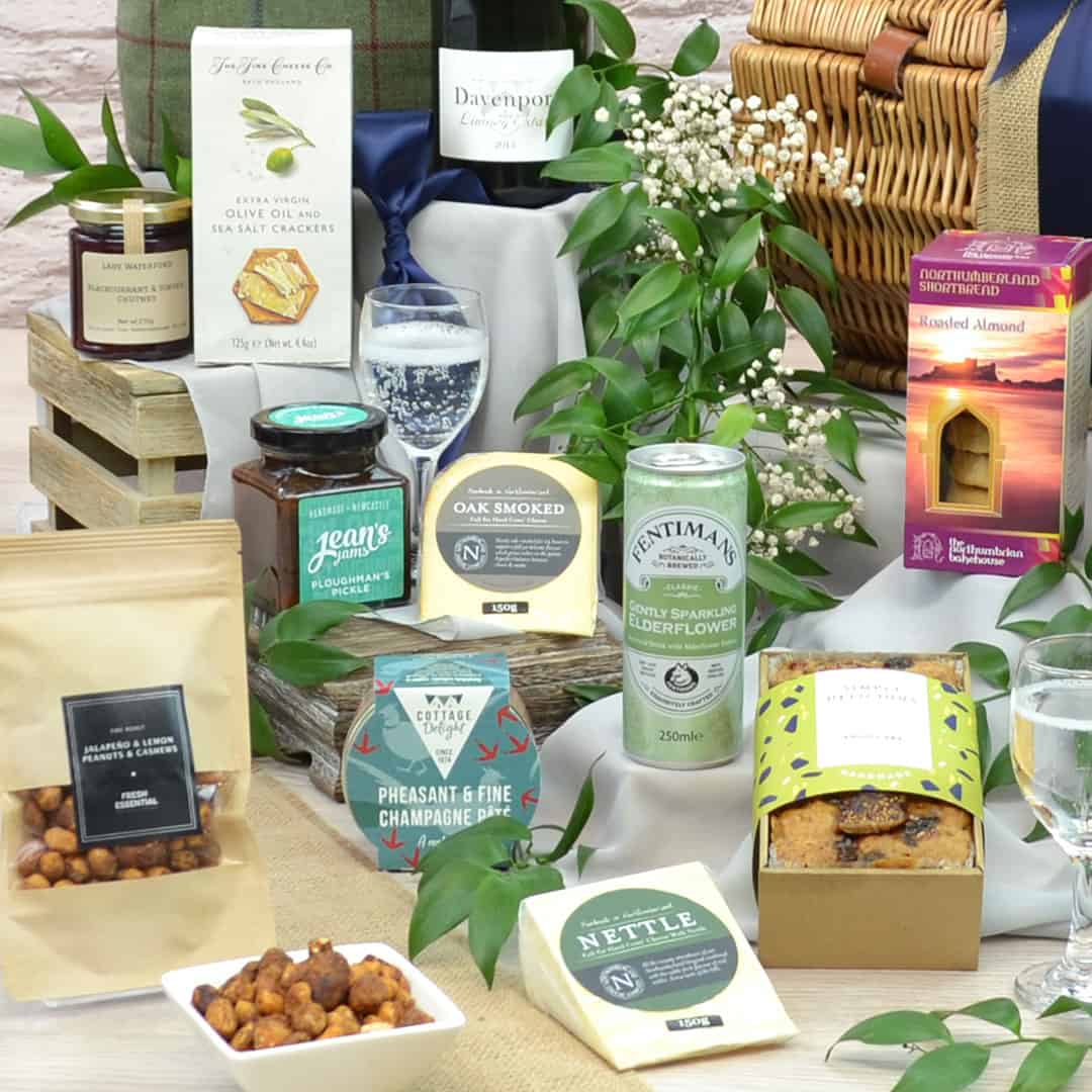 Next, there’s a selection of savoury treats such as the two deliciously creamy Northumberland Cheese wedges. To accompany the cheese, we have chosen a Pheasant Pâté, Olive Oil Crackers, and two handmade preserves – Ploughman’s Pickle and Blackcurrant & Ginger Chutney. This English Wine Picnic Hamper also includes Truffle Salted Mixed Nuts and Lightly Salted Hand-Cooked Potato Crisps.