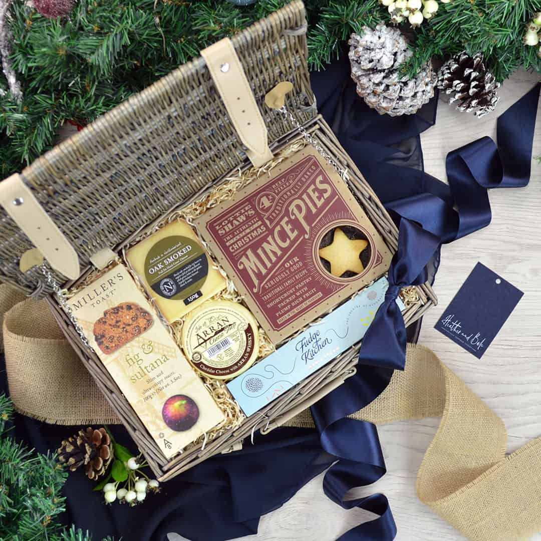 Immerse yourself in the duo of Oak Smoked cheese and Arran Whisky cheese. Relish the sweet and spicy symphony of Pear & Ginger Chutney. Complement your cheeseboard with the ultra-crisp Fig & Sultana Toast by Miller’s, a cracker bursting with fruity goodness. Moreover, the sweet notes continue with Mince Pies and the Sticky Toffee bar by North Chocolates.