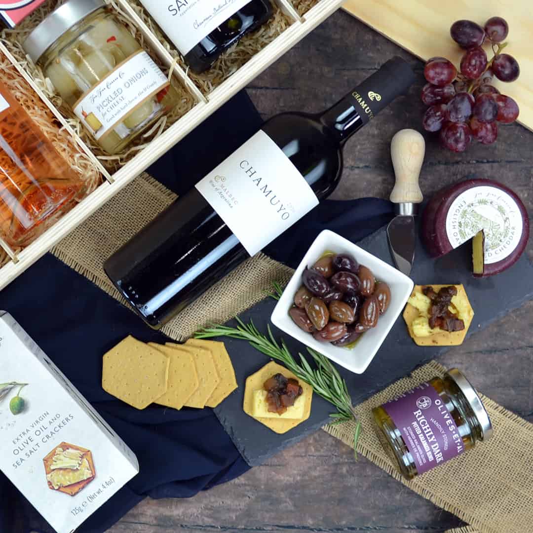 Pair your wine with exquisite cheese options from The Fine Cheese Co: Original and Oak Smoked Cheddar. Enjoy these with Extra Virgin Olive Oil & Sea Salt Crackers, the perfect addition to your cheeseboard.