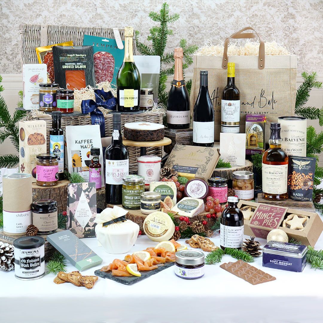 Introducing The Longhoughton Luxury Christmas Feast, a grand and generous Christmas Gift Hamper, designed for true gourmets and connoisseurs of fine food and drink. Presented in a traditional wicker basket with alongside a luxurious Heather and Bale hessian bag. This festive collection offers an impressive array of carefully curated, small-batch artisan products.