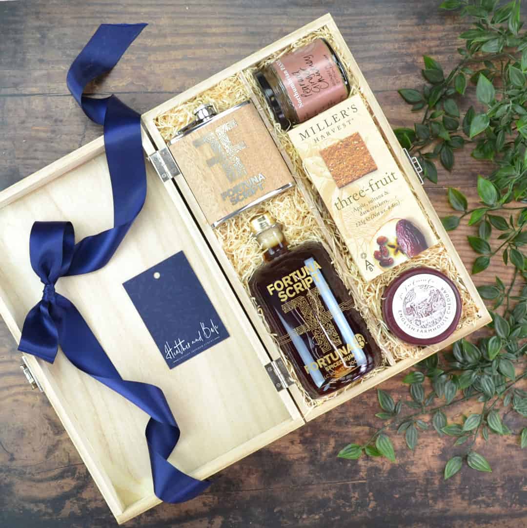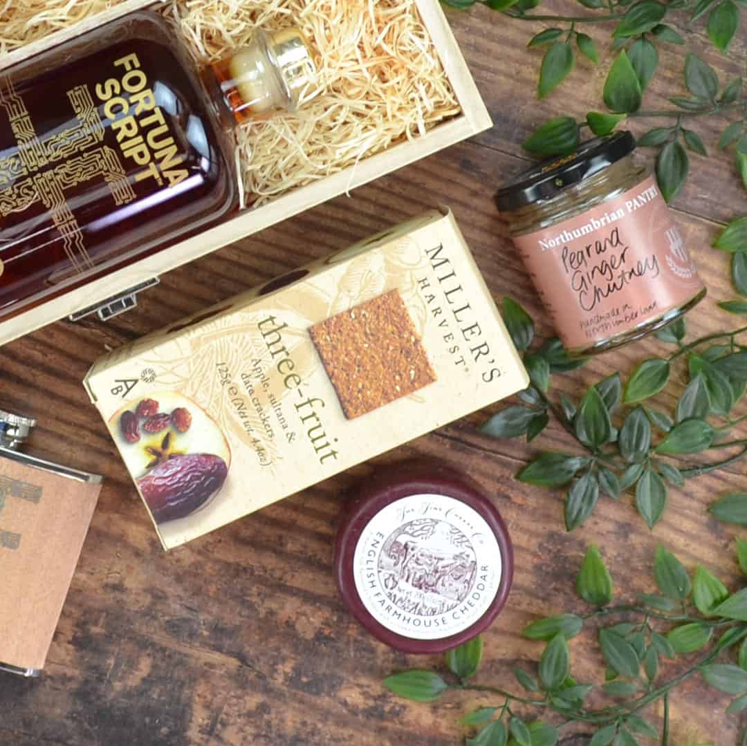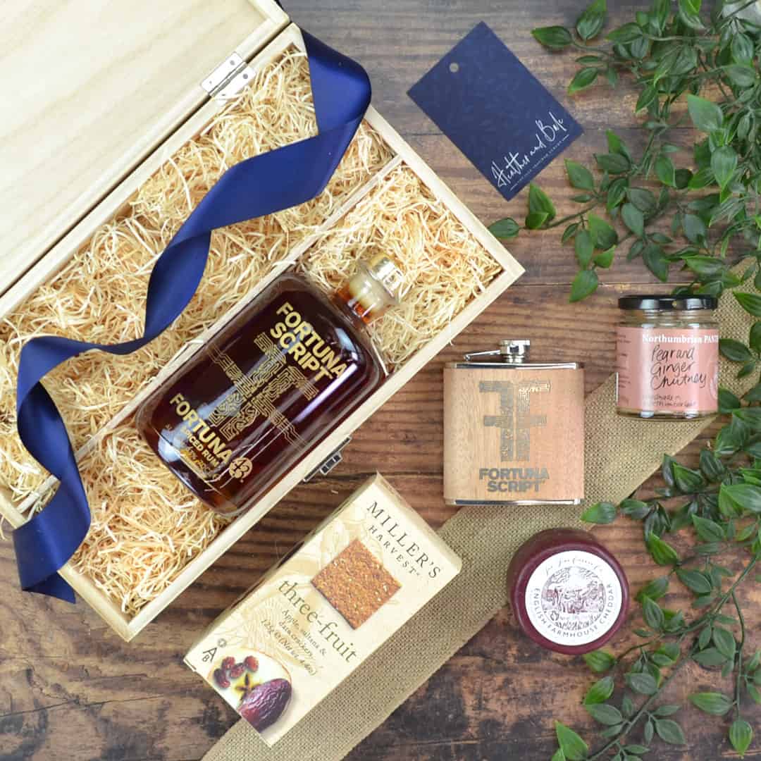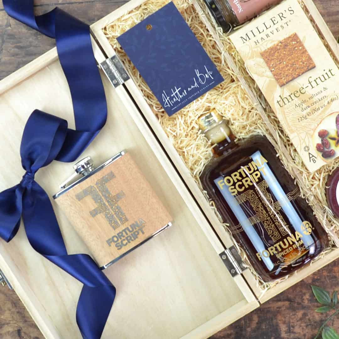 In addition, find a selection of delights to complement the flavours of this fantastic spirit. First, there’s English Farmhouse Cheddar and a homemade Pear & Ginger Chutney. Enjoy alongside Miller’s Three-Fruit Crackers. Finally, this Spiced Rum Hamper, is finished with a Fortuna Script hip flask.
